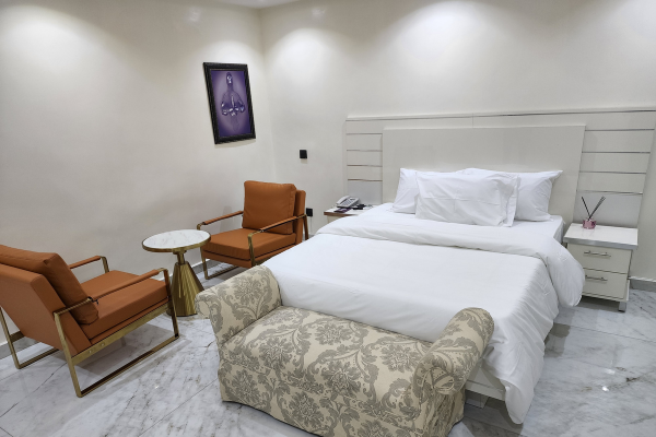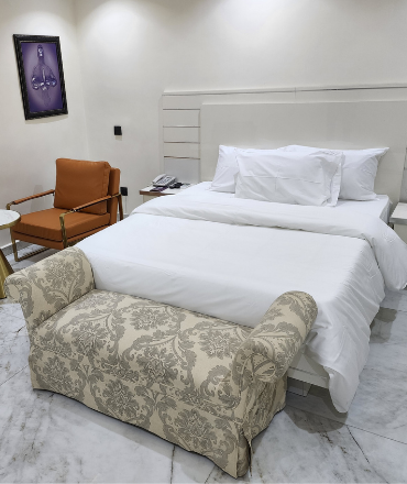 We offer our guests a perfect blend of relaxation, comfort and convenience with free WIFI. All our rooms are equipped with AC, Table top chillers, Smart Flat screen TV (50 inch’- 65 inch’) which comes with DSTV Premium Package + PVR access (i.e. every guest has a PVR remote). Our beds are hybrid 12inch’ -14inch’ super king and queen size with pillow toppings. Our pillows are memory pillows that help you sleep in the best position for your spine. A complimentary continental, full English and Nigerian breakfast is available every morning.